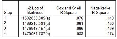 In the second column, “the R Square of Cox and Snell is a general coefficient of determination used to estimate the proportion of variance of the dependent variable explained by the predictors (independent variables). The R squareof Coxand Snell is based on the comparison of the log of likelihood (LL) for the model with regard to the log of the likelihood (LL) for a model of line base. Its values range between 0 and 1.”[3] In our case it is a low value (0.088) what indicates that only 8.8% of the variation of the dependent variable is explained by the variables included in the model.