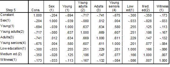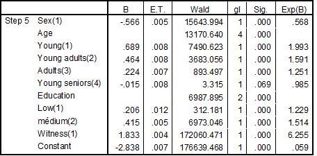 Logit(p) = -2.838 + 1.833witness – 0.566sex + 0.689young + 0.464young adults + 0.224adults – 0.015young seniors + 0.206lowed + 0.415mediumed
